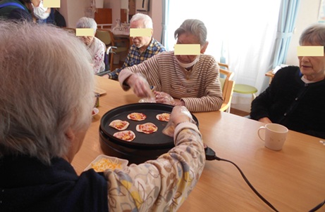 入居者様には材料を混ぜていただき、スタッフがパンケーキを焼きました。