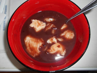 このお汁粉のお餅は白玉粉にお豆腐を混ぜて作っているので柔らかくて