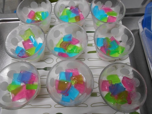 ミルクプリンの上にカラフルなゼリーを散りばめました。