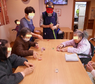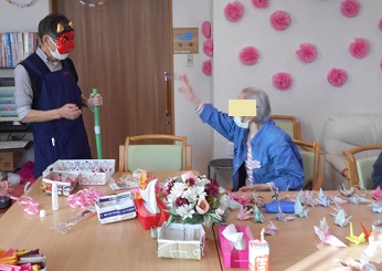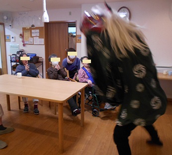 邪気を払い、福が訪れるように豆を投げましたが、入居者の皆さんは優しく鬼に向かって軽く豆を投げられていました。